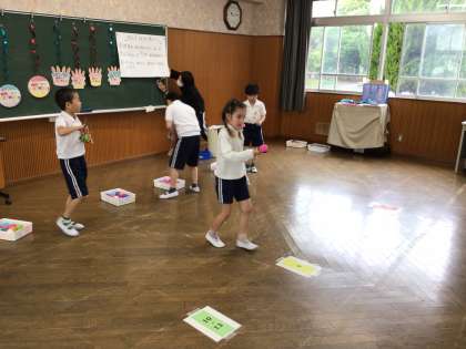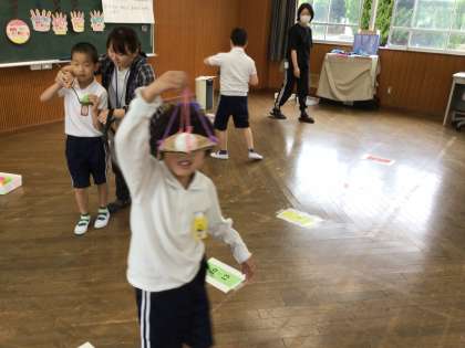 お祝いの後はみんなで楽しくゲームをしています。今回はボールを速く運ぶゲームをしました。