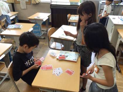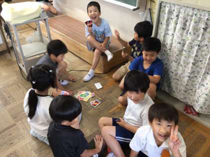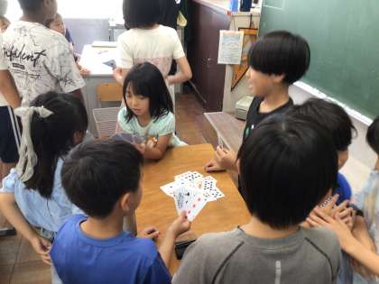 今週はWBGTが31度を超えたことで、前小タイムや昼放課に外で遊べない日が続きました。放送を入れる度に落胆する様子が目に浮かび心が痛みます。ただ、教室の様子を見に行くと、各学級用に購入したカードゲーム等で楽しく遊ぶ様子も見られました。2人で遊ぶ子もいれば、大人数で遊んでいる子たちもいて、室内での楽しみ方もそれぞれでした。