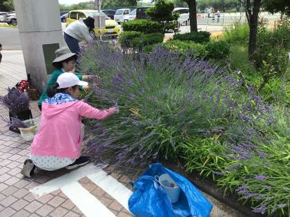 今年度は、特色ある学校づくり推進事業の一環で体育館横などにも新たにラベンダーを植えました。正門横のラベンダーも満開で見頃となり、あちらこちらで良い香りが漂っています。今日前サポさんが、ラベンダー摘みにきてくださいました。摘んだラベンダーは地域支援室の入り口に干してくださったので、きっと子どもたちも香りに気付くことと思います。7/3の委員会時には環境委員会の児童がサシェづくりを行います。その折にはまたご参加いただけると助かります。暑い中、たくさんの方にお手伝いいただきありがとうございました。