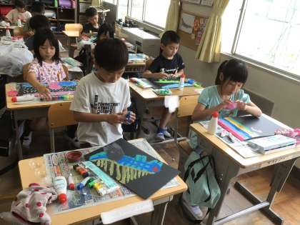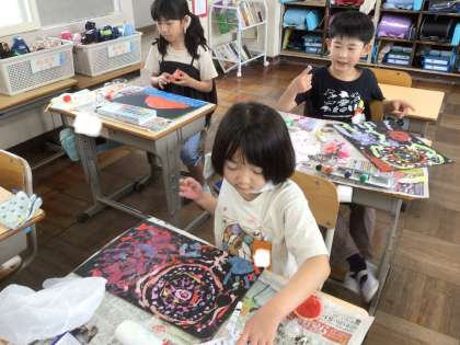 図工で、絵の具にドロリーという材料をまぜてとろとろにして絵を描く「とろとろえのぐ」の学習をしました。はじめは指で触ることにどきどきしていた子も、冷たくて気持ちのよい触り心地に楽しみながら活動することができていました。指や手を使って思い思いの作品に仕上げていました。