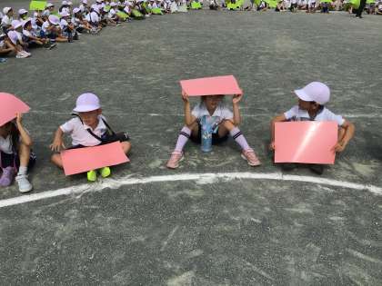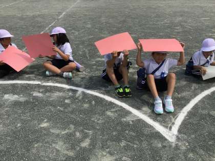 それぞれ決められた色の画用紙を持ち、しっかりと立って撮影をする事ができました。その後、撮影をしてくださった飛行機に笑顔で手を振りました。とても楽しい経験ができました。