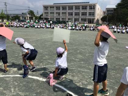 6月20日(金)に、前山小学校75周年キャラクター「やまっぴ」の航空写真撮影を行いました。