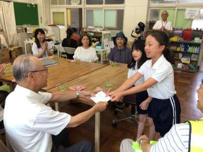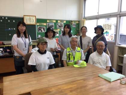 本日、水源町自治区の区長様をはじめ、安全ボランティアの皆様、交通指導員さんを地域支援室のきずなカフェにお招きしました。最近は気温が大変高くなっていますが、そんな中でも毎日子どもたちの登下校の安全を見守ってくださり、本当に頭が下がります。前小タイムには、水源地区の児童が来て、日頃の感謝を伝えました。中にはお礼の言葉を書いてきた子もいて、皆様に喜んでいただきました。子どもたちから元気をもらっていますと言ってくださる方もいて、大変ありがたく思いました。熱中症対策や不審者対応にも心を配っていただいていて、改めて、地域の方に見守られて子どもたちが安全に登下校できていることを再確認できました。いつも本当にありがとうございます。