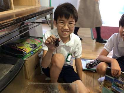 生き物広場のカブトムシが成虫になりました。たくさんある虫かごの土の中には、何匹もいるようです。カメや魚たちもとても元気で、憩いの場になっています。