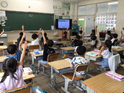 1年生が算数の授業で10までの足し算をしていました。問題が表示されると、みんな元気よく手を挙げて答えていました。