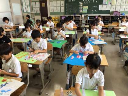 4年生は図工の授業で、絵の具で作った模様を使って鳥を作っています。どの作品もオリジナリティに富んでおり、子どもたちも黙々と作業を進めています。