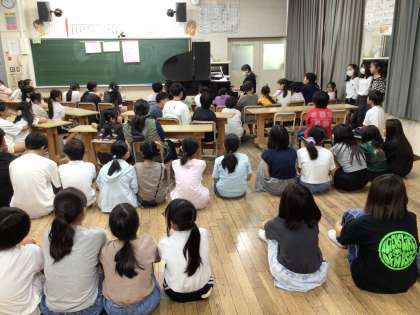 10日の前小タイムにも、心の相談員さんによる"サマーコンサート"が開催されました。今回も会場にはたくさんの子どもたちが集まってくれました。今回は「プレリュード」「カノン」「翼をください」「夢はひそかに」の4曲を演奏して下さいました。子どもたちは、体を揺らしたり、口ずさんだりとピアノの音色に聴き惚れていました。