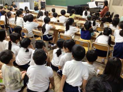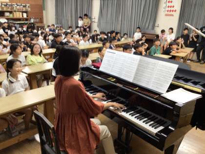 教員によるミニコンサートが、前小タイムとお昼の休み時間に開催されました。音楽室には、ピアノの演奏を聴こうとたくさんの子どもたちが集まりました。今日の演奏曲は「ライラック」と「紅蓮華」です。聴いたことがある子どもたちが多く、曲名を聴いてますます楽しみにしていました。どの子も、ニコニコしたり、歌詞を口ずさんだりして音楽にのって聴いていました。休み時間はあっという間に過ぎてしまい、まだまだ聴きたいとミニコンサートが終わるのを名残り惜しそうにしていました。