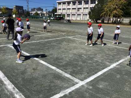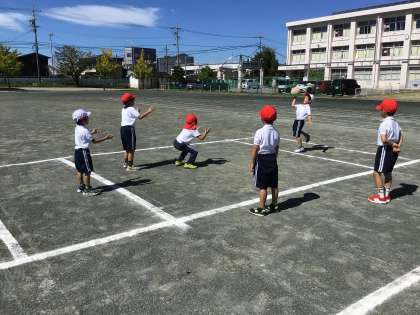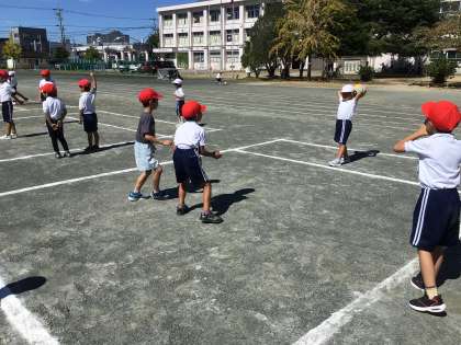 体育科では、「ボール投げゲーム」の学習を行っています。段ボールの的を狙ってボールを投げたり、「ゲットボール」という相手チームの投げたボールをキャッチすると点数が入るゲームをしています。子どもたちは、授業のはじめと比べると、徐々に遠くにボールを投げられるようになってきました。涼しくなってきた運動場で楽しく活動しています。