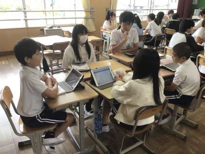 国語科の「話し合って考えを深めよう」の学習では、学級で決めたテーマについて、立場を明確にしながら話し合いをしました。異なる立場の意見をもつ相手に対しても、理由を詳しく聞いたり、意見を受け止める言葉選びをしたりしながら話し合う様子が見られました。