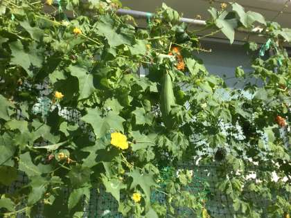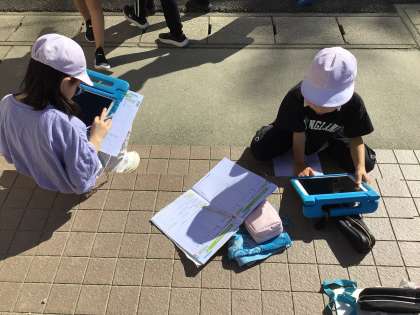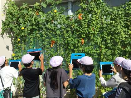 4年生が育てたツルレイシの観察をしていました。校長室の窓一面を覆い尽くしていて、緑のカーテンとしての役割も果たしています。学習用タブレットで写真を撮り、熱心にノートにまとめていました。