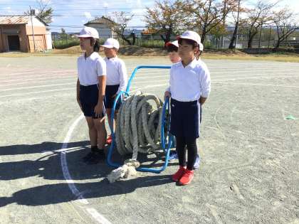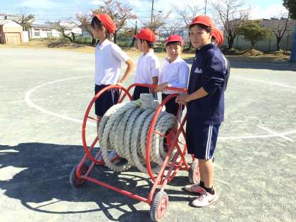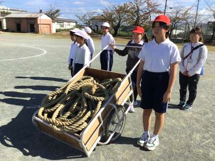 運動会の全校練習で全校綱引きの練習を行いました。体育委員の児童が綱の準備や片付けをテキパキと行ってくれました。応援団の児童も応援を盛り上げてくれ、本番さながらの熱の入った練習になりました。