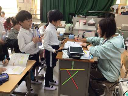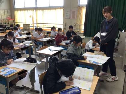 教員を目指している学生ボランティアも定期的に授業でサポートしてくれています。わからないことを聞いたり、つまずいているところを丁寧に教えてくれたりするなど、子どもたちにとって頼りになる存在です。