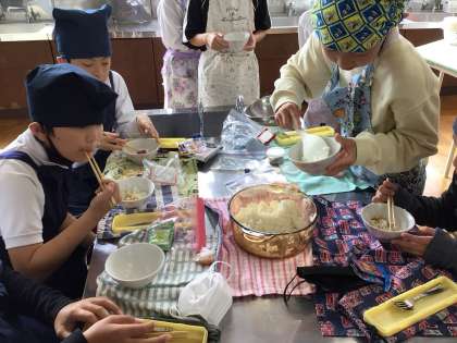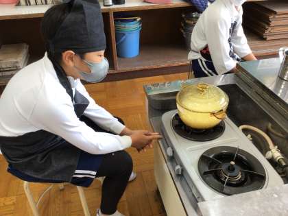 5年生は運動会練習の合間をぬって、調理実習を行っています。前サポさんがサポートしてくださるので、安心して取り組むことができています。廊下にいても、米の炊ける美味しそうな匂いがただよってきました。