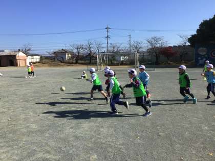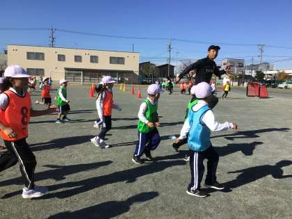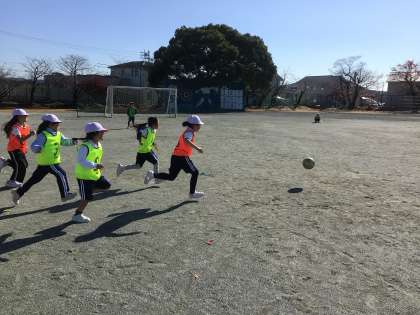 グランパスの方々によるボールクリニックが行われました。最初は「サッカーできるかなぁ。」と不安がっていた子も、コーチによるたくさんの工夫や声掛けによって、とても楽しそうにしていました。最初はステップなどのウォーミングアップ、ボールを蹴りながら進む、そして最後は試合です。どの子も一生懸命ボールを追いかけ、ゴールにシュートしようとしていました。まだまだやりたい様子はありましたが、とても満足そうに活動を終えました。また、サッカーができる機会が楽しみですね。