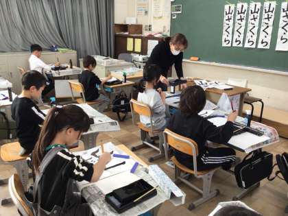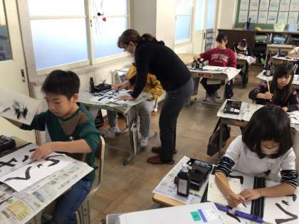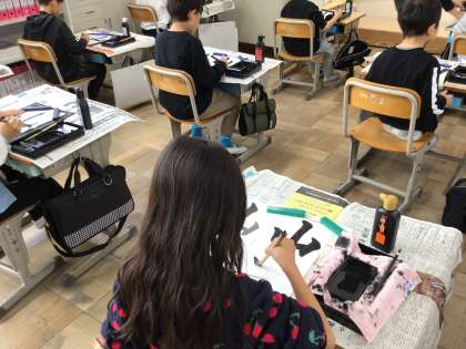 書き初め大会の練習が始まりました。講師の先生をお招きし、毛筆のコツを教わりました。子どもたちは「賞をとるぞ」という気持ちで丁寧に書いていました。