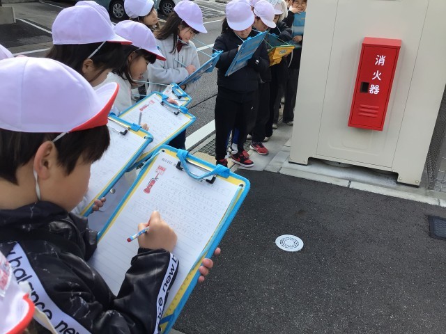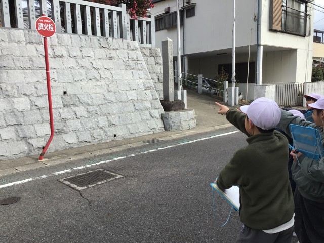 町を火事から守る仕組みを探すために、前山地区を歩きました。自分たちが思っていたよりも多くの消火栓や防火水槽を見付けることができ、驚きながらも他にもないか熱心に探していました。