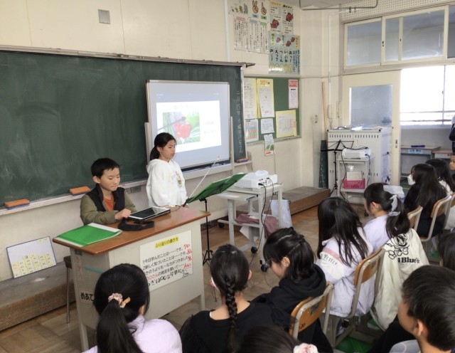 学習発表会で、総合で学んだ田んぼや畑、自動車学校について調べたことを発表しました。子どもたちは、大きな声や話すスピード、話している表情に気をつけて発表しました。