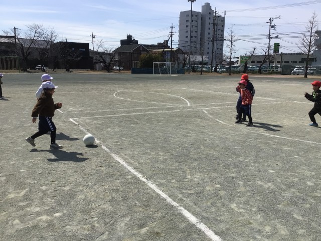 体育科では、「ボールけりゲーム」の学習を行っています。コートの中の円で守っている人にボールを止められないように、ボールをコートの向こうまで蹴るというゲームをしました。蹴る人はどこに向かって蹴ったらよいか考えたり、守る人は守る場所を考えたりしながら、楽しくゲームをすることができました。