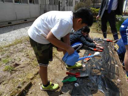 前もって作っておいた畝に、ジャガイモの種芋を植え付けました。明和は寒いので、畝が温かくなるようにマルチをかぶせた畝に受け付けました。たくさん美味しいじゃがいもができることを楽しみに植えました。