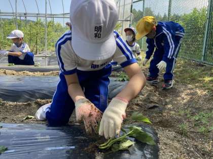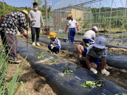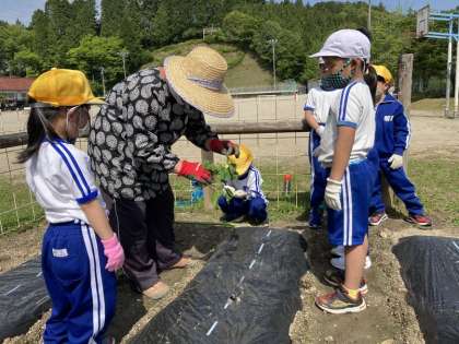 1・2年生でサツマイモのつるを植えました。植え方のこつをいづみさんに教えていただき、50本のつるを植え付けました。おいしいサツマイモがたくさんできるように心をこめて植えました。