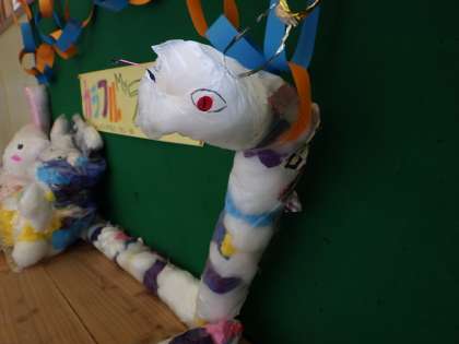 廊下には、子どもたちの図工の作品が飾られています。