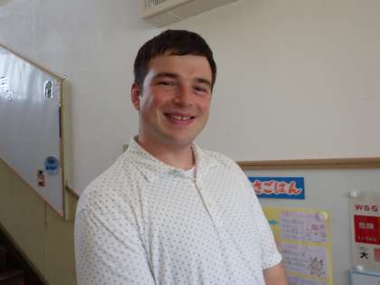 「カイル先生、お久しぶりです!」一緒に給食を食べた2年生は大喜びです。午後からの2時間はカイル先生の外国語の授業があります。