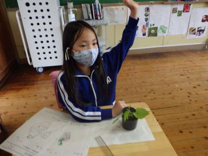 ツルレイシの生長を観察しています。葉の形の特徴や色のちがいに気付きました。