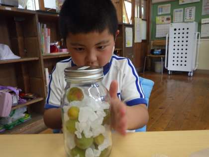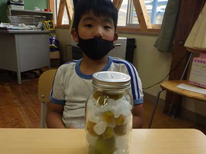 煮沸消毒した瓶に、凍らせた梅と氷砂糖を交互に入れていました。どんなふうにシロップになっていくのでしょうか。学校生活の楽しみがまたひとつ増えました。