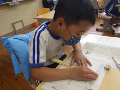 「言葉で絵を伝えよう」という学習でした。さまざまな形をどのように言葉で伝えるかを考えていました。