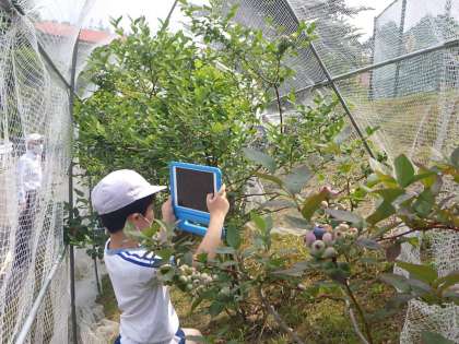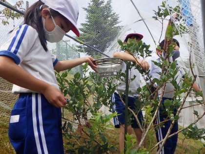 6月22日 3・4年総合「ブルーベリー初収穫!」 公開日 2021/06/23 更新日 2021/06/23 各学年から 学校敷地にはたくさんのブルーベリーの木があります。3・4年生が世話をしています。たくさんの実がなっています。むらさきに色付いてきました。実の様子を写真に撮ってから、約80個、収穫できました。