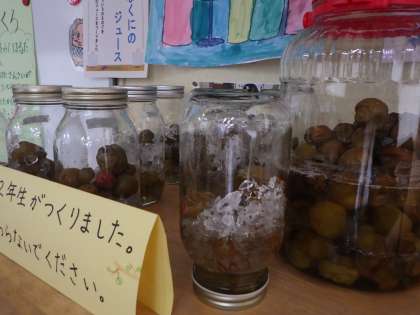 1階廊下はトイレに行くときの通り道でもあり放課になると全校児童が行き交います。廊下に置いてある梅シロップに興味津々です。氷砂糖が溶けてきています。1・2年生は自分の瓶をふったり逆さにしたり。どんな味か楽しみですね。