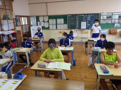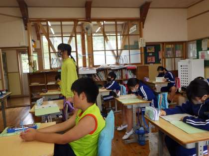 学校敷地や展望台までの木を調べています。先日、外部講師の岡田さんに教わったことをみんなで出し合い、まとめていました。「ウメモドキは秋には赤い実がなる」「タンコウバイはみかんみたいな匂いがする」「ヤブムラサキはふわふわの葉っぱ」…五感を働かせて教わり、身近な木が少しわかるようになっています。