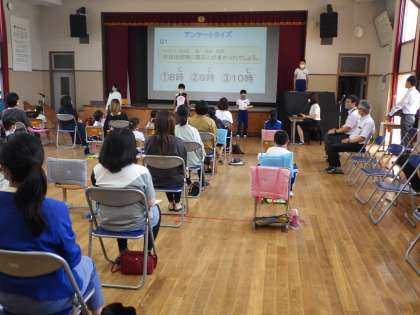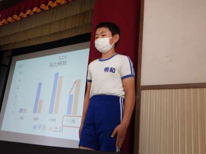 6月24日 学校保健委員会1 公開日 2021/06/24 更新日 2021/06/24 学校行事 健康委員会の4人が劇をしました。主人公のネムリ君は登校中足取りが重いです。そのわけは昨晩…。練習の甲斐あって、大きな声でのびのびと演じていました。