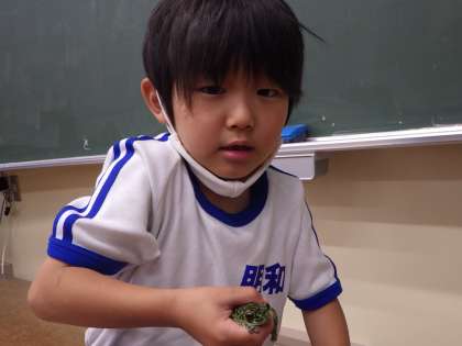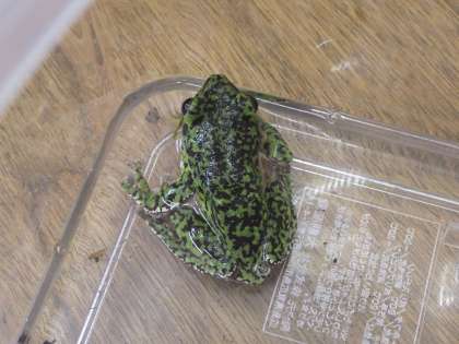 児童の祖父様が子どもたちに見せるためにモリアオガエルを学校に持ってきてくださいました。今の季節に池の上の木の枝に泡のようなたまごを産みます。