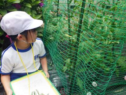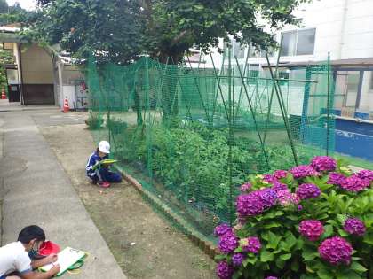 2年生はミニトマトを観察して絵をかきました。黄色い花が咲いています。