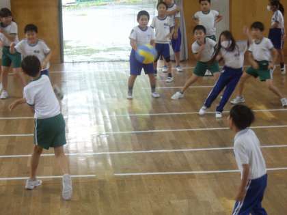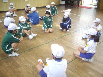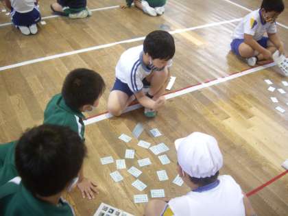 中学年の会場は新盛小学校でした。班対抗で百人一首をしました。道徳では「心をしずめて」という題材で相手と分かり合う大切さを学びました。体育はいつもより多い人数でドッジボールをして、たいへん盛り上がりました。