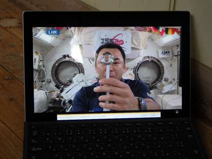 3〜6年生はタブレットを持ち帰り、指定された時間にJAXAに接続しました。筑波宇宙センターの油井宇宙飛行士の解説を聞いた後、国際宇宙ステーションの星出宇宙飛行士によるライブ動画配信を視聴しました。太平洋の上空を飛んでいる星出さんをリアルタイムで見ることができ感動的でした。