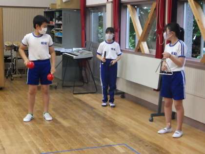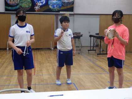 7月9日 5・6年音楽の授業 公開日 2021/07/09 更新日 2021/07/09 各学年から 「ラバーズコンチェルト」の曲に合わせて3パターンのリズムの打ち方を習いました。トライアングル、すず、マラカス、タンバリンなどの楽器を組み合わせて、グループ発表を行いました。