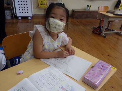 絵日記の書き方を習いました。夏休み中に、友達に伝えたいこと、先生に伝えたいことがあったとき、絵日記に書いておきましょう。字がとてもきれいに書けるようになっています。