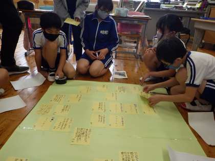 明和学区には山がたくさんあります。山には人が植えた木と自然に生えた木があることがわかりました。だれがいつ頃、なぜ山に木を植えたのかな?インタビューをしてわかったことを出し合いました。
