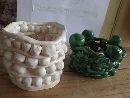 ひもだんご土器が焼き上がりました。織部、うす青、乳白色の釉薬の色が素敵です。何を入れるのかな?
