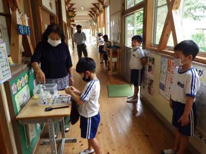 9月1日 身体計測も密を避けて 公開日 2021/09/01 更新日 2021/09/01 学校の特色ある活動 並んで待つ場所に足形を貼り、距離を保つ工夫をしました。測定器具の消毒、運搬した子どもたちの手指消毒。時間をかけて、全学年の測定が終わりました。