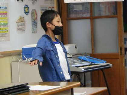 「What did you do in this summer vacation?」という言い方を覚えました。発表者にみんなで声をそろえて尋ね、発表者が答えました。「足助城に行ったよ」「流しそうめんをしたよ」…「行った」は「行く」(go to)が「went to」に変わることもわかりました。