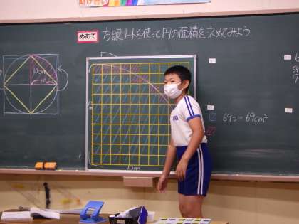 「方眼ノートを使って円の面積を求めてみよう」という課題に挑戦。半径10cmの円の4分の1の面積を考えました。