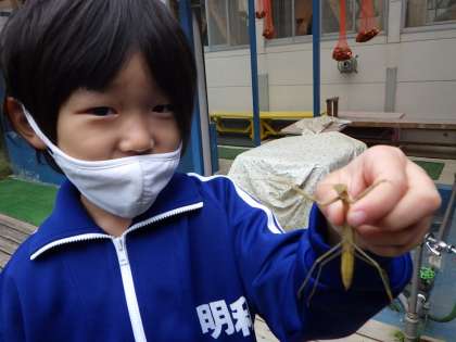 中庭の畑にショウリョウバッタやカマキリがいました。「カマキリは肉食だよ」「でもこのバッタは大きいから食べられないよ」…身近な自然から食物連鎖を学んでいます。