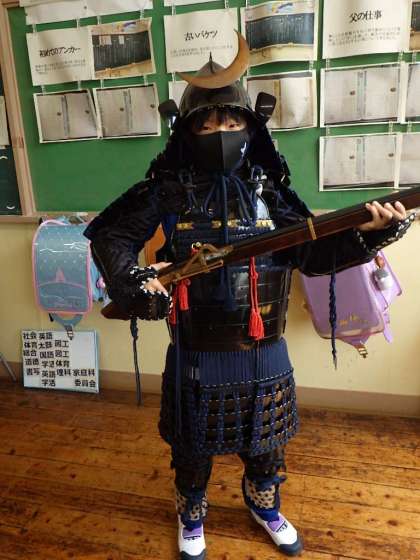 昨日の出前授業で豊田市郷土資料館から貸していただいたよろいを5・6年生が全員試着しました。「重い」「動きにくい」「がちゃがちゃ音がする」…戦国時代の武士の大変さを実感しました。