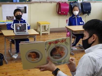 小島先生に「手で食べる?」を読んでいただきました。国によって食事の食べ方が違うことがわかり、興味津々、聞いていました。