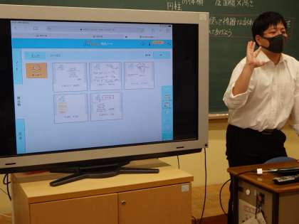 9月14日 6年算数「角柱・円柱の体積」 公開日 2021/09/14 更新日 2021/09/14 各学年から 「複雑な立体の体積を求める方法を伝え合おう(底面積×高さの公式を使って)」という課題で、タブレットを使って解き方を考えました。そのあと、電子黒板に映して考え方を説明しました。4通りもの求め方があり考え方が広がりました。