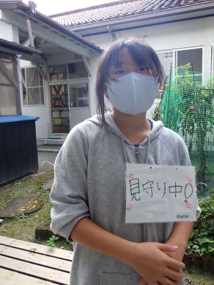 健康委員の子たちが「見守り中」のプレートを付けてみんなに手洗いを呼び掛けます。緊急事態宣言下の学校生活の一コマです。
